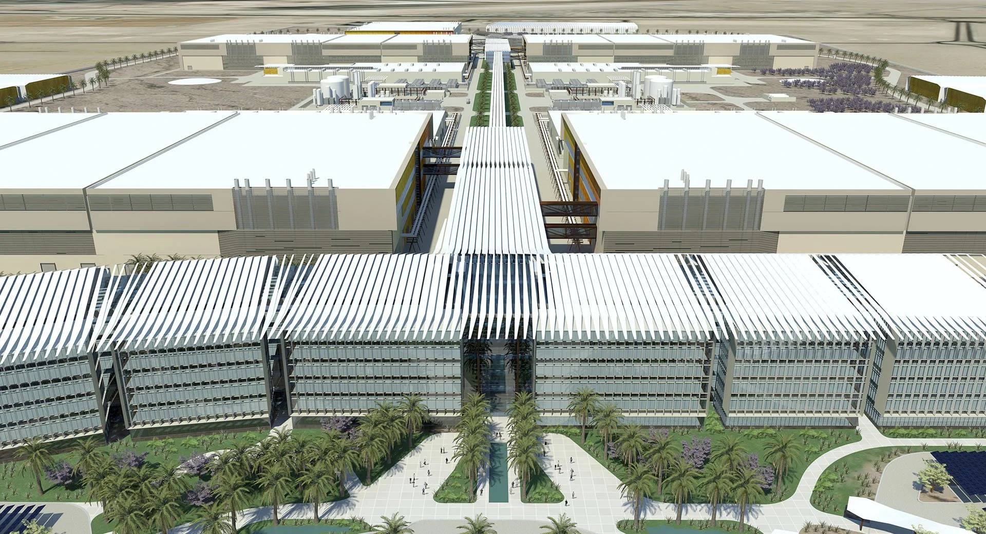 Inspired by vernacular traditions, strategically isolated landscaped oases will be provided however throughout the site, solely irrigated by the use of process waste water. Further, photovoltaic canopies will be utilized to not only produce enough energy to power all of the campus and building lighting, but will also serve as valuable shading throughout the vast expanse of parking required on-site. In terms of the buildings themselves, each of the facilities was envisioned to be designed to a 2 Pearl Estidama rating, essentially the equivalent of LEED™ Silver.
